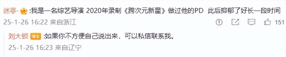 在刘大锁发文的评论区,有位网友留言,表示自己是一名综艺导演,在2020年录制《跨次元新星》时做过张大大的PD,也就是跟随张大大进行拍摄的导演,他们需要和艺人保持密切沟通。这位网友透露节目录制后,抑郁了好长一段时间。