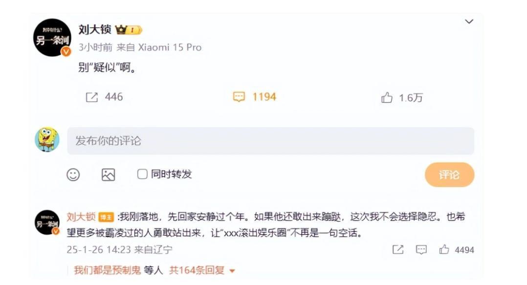 刘大锁表示,自己先准备安静过个年,如果他还敢出来蹦跶,这次自己不会选择隐忍,同时也希望更多被霸凌过的人勇敢站出来,让“XXX滚出娱乐圈”不再是一句空话。