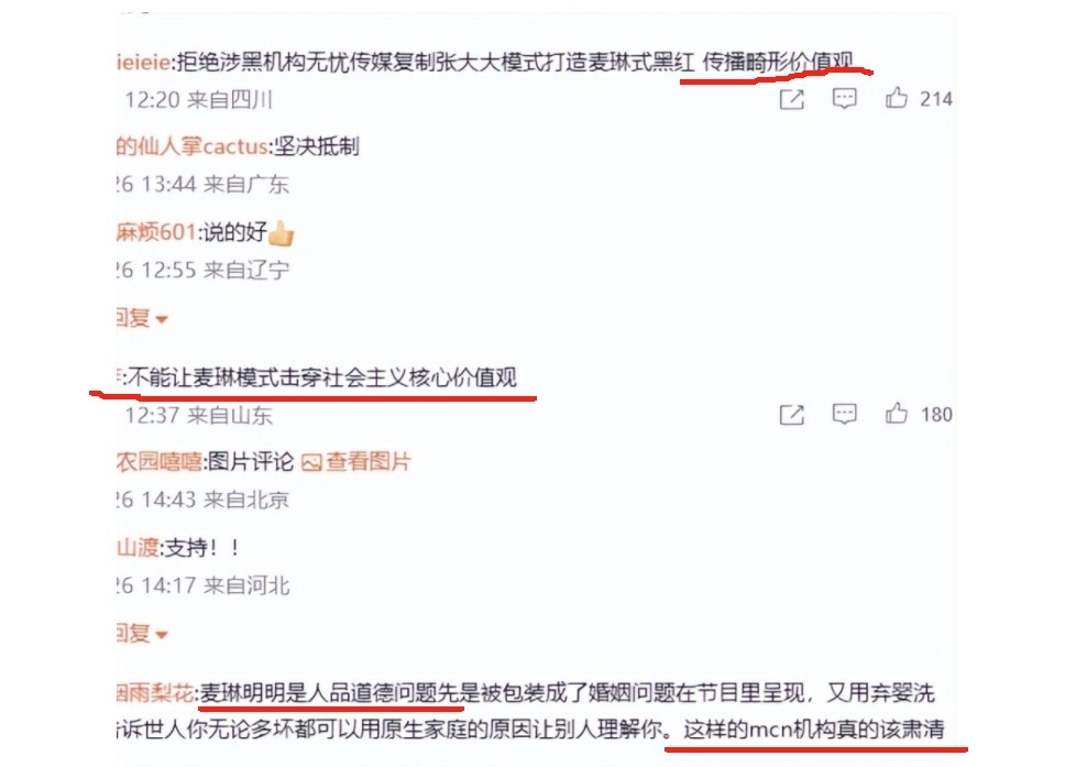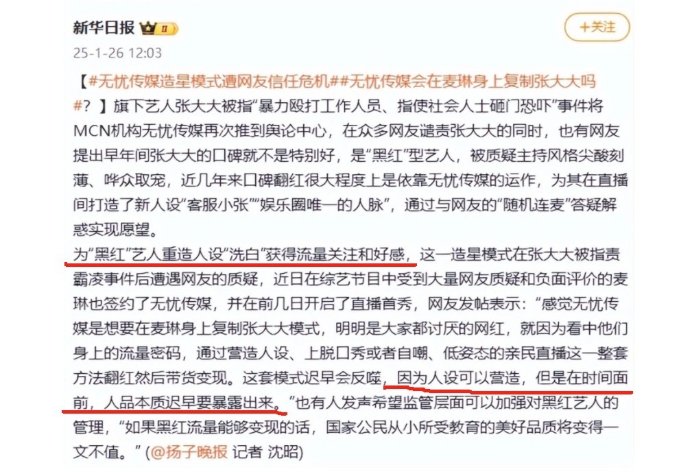 有网友发现,前不久在综艺节目《再见爱人4》中同样受到不少质疑的的麦琳也签约了无忧传媒,并开启了直播首秀。有网友直接指出背后的逻辑:无忧传媒应该是想要在麦琳身上复制张大大模式,虽然是大家都讨厌的网红,但是看中了他们身上自带的流量。